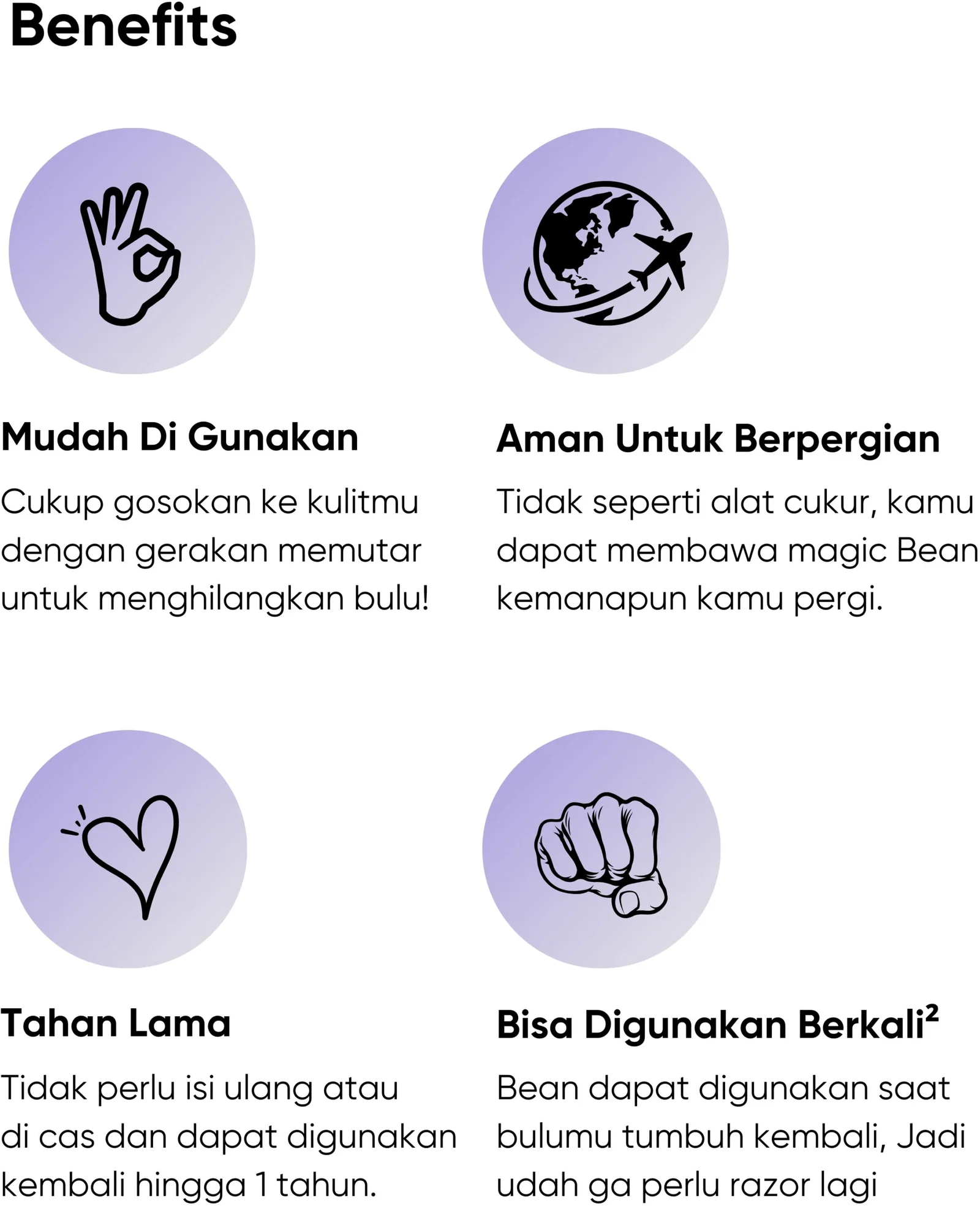Dengan menggunakan teknologi Nano-Crystalline, Magic Bean memungkinkan bulu-bulu untuk menggumpal dan tercabut dari permukaan saat digosok dengan lembut di kulit. Proses ini juga membantu mengelupas sel kulit mati, sehingga kulit terasa halus seperti bayi setelah digunakan π