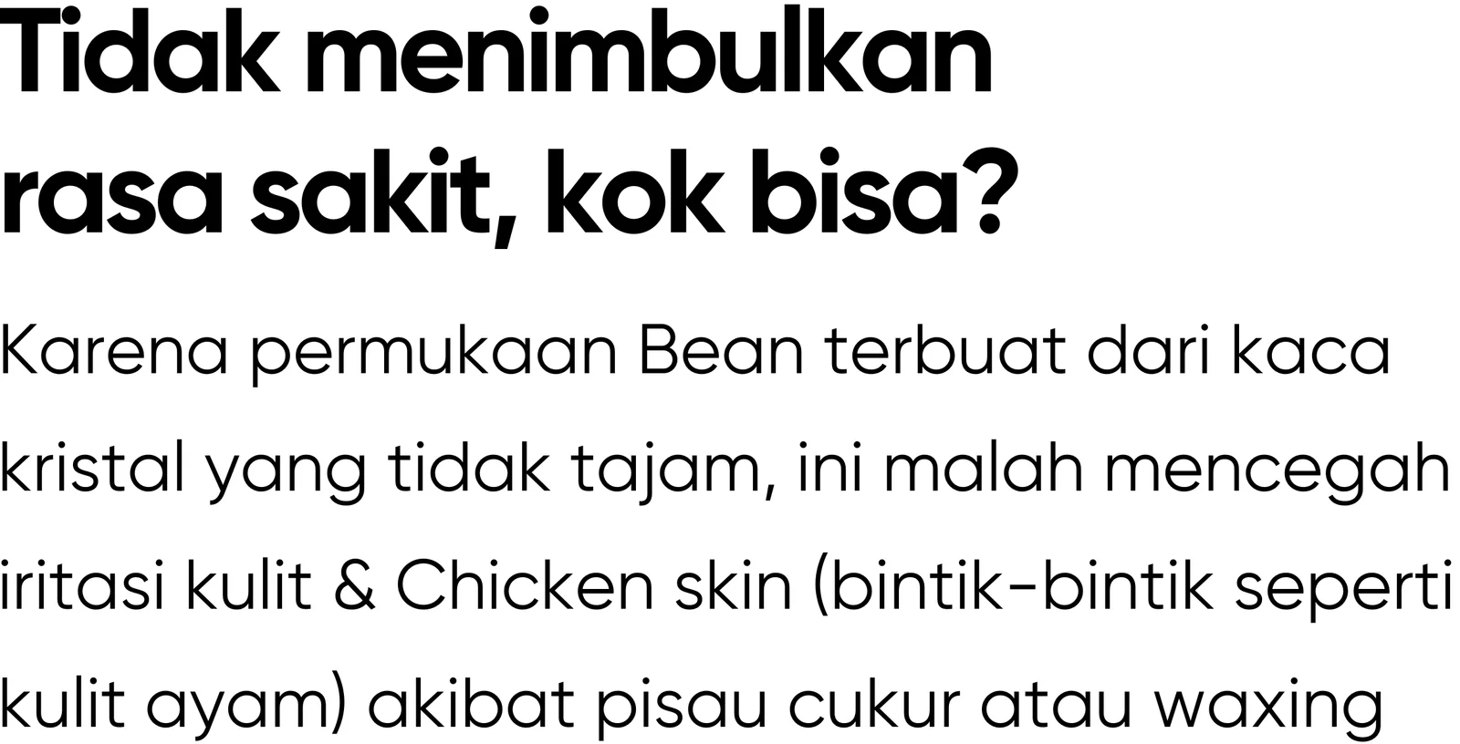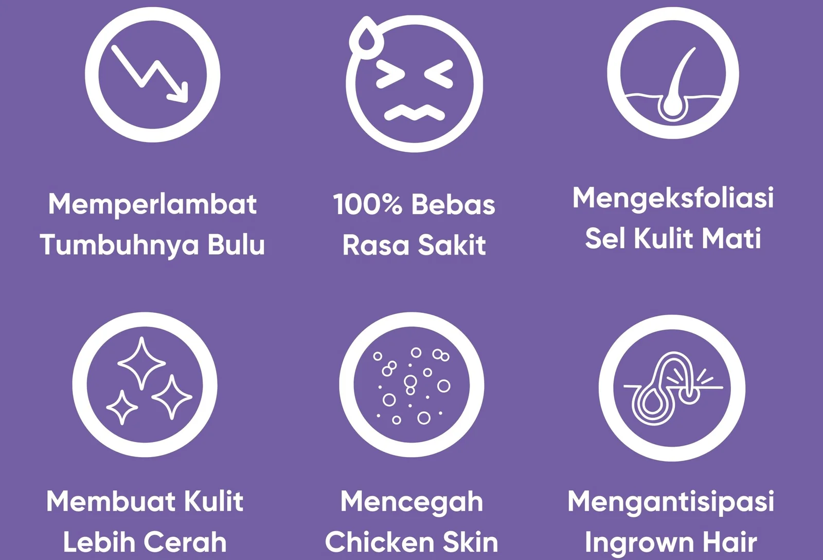 Mengangkat sel kulit mati Kulit jadi sehalus bayi Mencegah ingrown hair Mengatasi strawberry skin Kulit terlihat jauh lebih cerah Bisa digunakan BerkaliΒ² (1-2 Tahun)